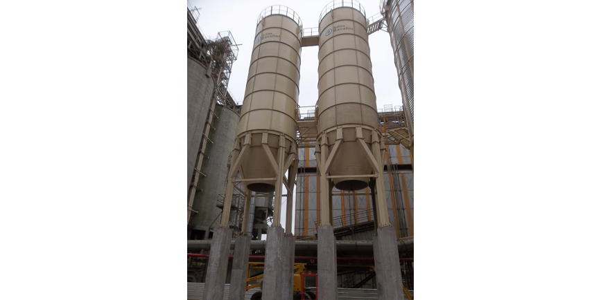 El cilindro del silo está compuesto por anillos de chapa de acero lisa con terminación de pintura epoxi interior. Los anillos son embridados y abulonados, con columnas de refuerzo exteriores, abulonamiento vertical y horizontal con bulones galvanizados, y sellado de los silos en todas sus costuras. Las vinculaciones entre componentes se realizan en la cara exterior, evitando bolunes en el interior de los silos para impedir el depósito de material no deseado que favorecería la posibilidad de aparición de agentes contaminantes.
